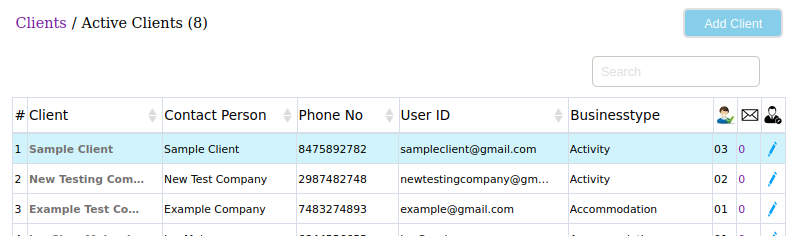 Search clients by Name, Company name, business type, phone no. etc., and sort () by category | |