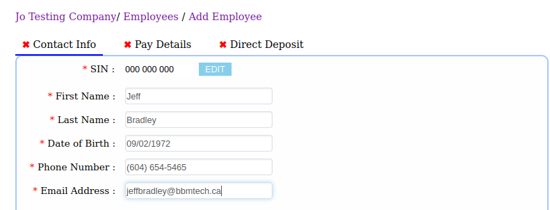 - Fill in all three tabs/sections which include employee SIN number, Contact details, pay information such as wage rate, bank details etc. Click on the Save button to update the details. (see also setup employee pay details)