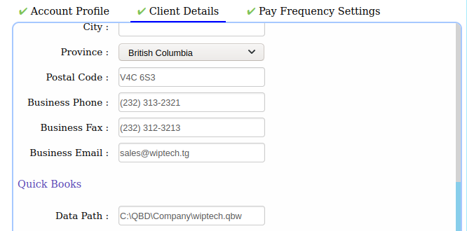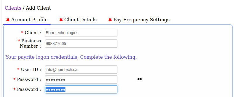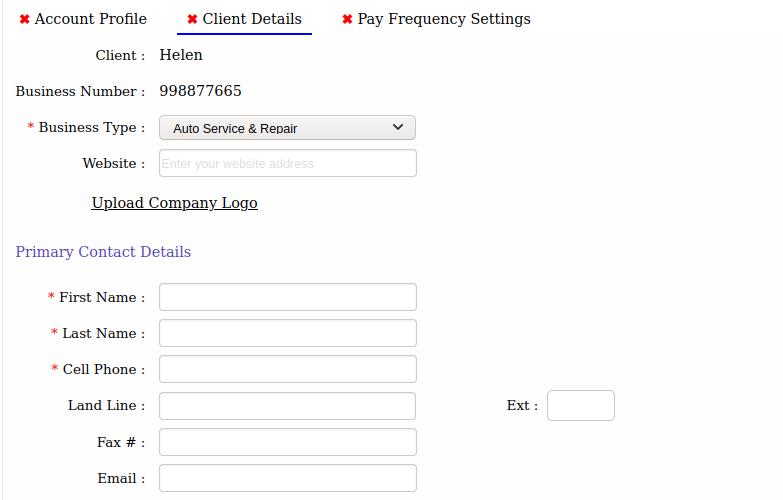- Fill in all three tabs/sections which includes client contact details, client login credentials, pay frequency. (see also how to set up a new pay frequency). Click on the Save button to update the details.