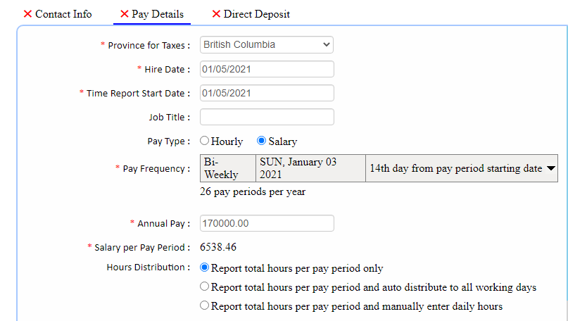 such as pay type, pay frequency, time report start date, time reporting type. (To see these details click on EMPLOYEES tab, click on employee name and see pay details)