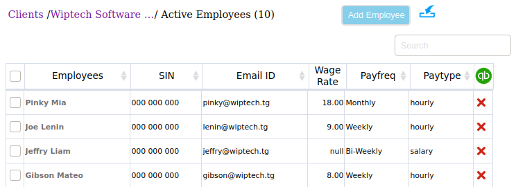 - Click on the client name. A new page will open which lists all the Active employees of the client.